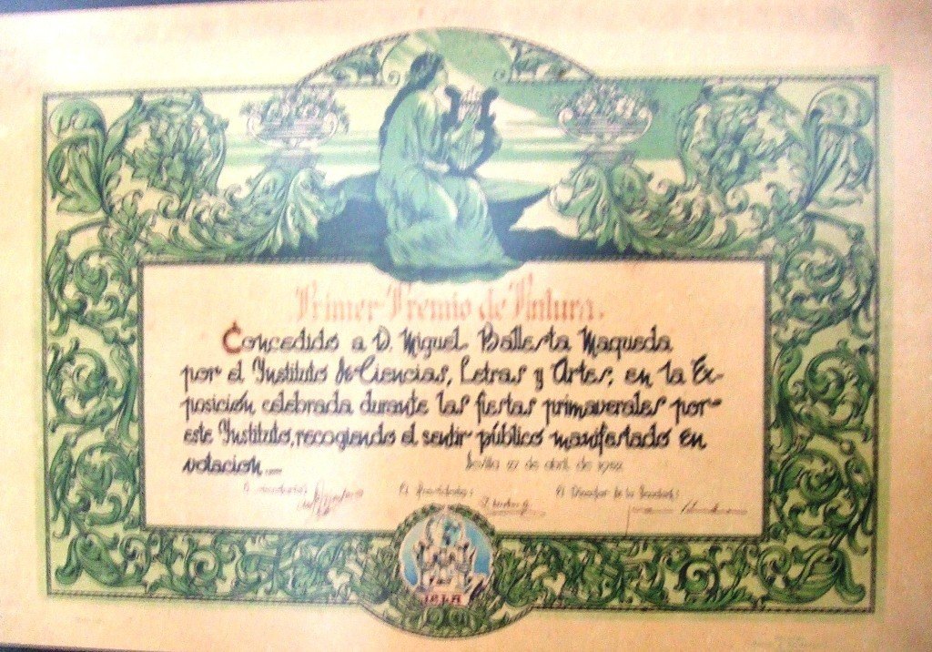 Premios y Diplomas de Miguel Ballesta Maqueda 1944 Segundo Premio por oposición en la asignatura Dibujo Artístico. 1946 Segundo Premio por oposición, en la asignatura Dibujo Artístico. 1947 Segundo Premio, por oposición en la Asignatura Dibujo del Antiguo. 1952 – 1 Primer Premio IV Exposición Provincial de Arte. Sevilla 1 de Abril. 1952 – 2 Primer Premio de Pintura, concedido por el Instituto de Ciencias, Letras y Arte, recogiendo el sentir público, manifestado por votación popular. 1971 Mención Honorífica. XIII Salón de Nacional de Pintura. Gibraleón (Huelva). 1974 Diploma de agradecimiento como expositor en la I Expo-Pintura Regional, para profesionales. Moguer(Huelva), septiembre. 1975 Medalla de Plata en el II Salón Municipal de Pintura y Escultura, organizado por el Ayto. de Sevilla 1976 – 1 Concesión del Perejil de Plata. Moguer (Huelva), noviembre. 1976 – 2 Primer Premio, Certamen Nacional de Pintura. Cartaya (Huelva) 1976 – 3 Premio Dirección General de Cultura Popular, XXV Exposición de Otoño. Sevilla. 1977 Medalla de Plata. VIII Salón de Pintura Andaluza de Moguer (Huelva). 1980 Premio Universidad de Sevilla. XXIX Exposición de Otoño. Sevilla, diciembre 1981 – 1 Medalla de Juan ramón Jiménez. El Ayuntamiento de Moguer a Miguel Ballesta Maqueda. Por su participación el el Centenario del poeta. 1981 – 2 Placa de agradecimiento de la Tertulia Flamenca el Pozo de las Penas, en su XXX aniversario. Los Palacios(Sevilla), marzo. 1981 – 1982 Premio Círculo de Labradores…. XXX Exposición de Otoño. Sevilla. 1982 – 1 La Peña Cultural y Comercial de Los Palacios(Sevilla) en su Semana Cultural de Otoño. 1982 – 2 Placa de reconocimiento por la realización del cartel de feria. Maribáñez (Sevilla). 1984 – 1 Pergamino en agradecimiento por el Cartel de la Romería de Montemayor. Moguer (Huelva), mayo. 1984 – 2 Premio Maestranza de caballería. XXXIII Exposición de Otoño. Sevilla. 1984 – 3 La Hermandad del Rocío de Sevilla al Pintor en Agradecimiento por la realización del Cartel del Cincuentenario de la Hermandad. 1985 – 1 Mención de Honor en el Primer Certamen Nacional de la Caja de Ahorro San Fernando de Sevilla. 1985 – 2 Premio Maestranza de caballería. XXXIV Exposición de Otoño. Sevilla. 1986 Premio Maestranza de Caballería. XXXV Exposición de Otoño. Sevilla. 1988 Premio Universidad de Sevilla. XXXVII Exposición de Otoño. Sevilla.